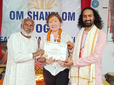 "Мое знакомство с Хатха йогой произошло в Ришикеше школа Ом Шанти Ом. Ранее я имела возможность знакомство с пародией на Хатха йогу где была физкультура, и здесь я поняла что это духовная практика и особый образ жизни - здоровый и счастливый. Я попала к настоящим учителям о которых можно мечтать. Динеш позитвный, добрый, наполненный жизненной энергией и в тоже время настолько талантливый и духовный человек. Мишра Джи с богатым опытом учитель философии которого интересно слушать и наблюдать за его искренностью. Я очень счастлива что Бог меня привел именно сюда и именно к Павлу, Светлане, Олесе и замечательным учителям, которые создали незабываемый, насыщенный, интересный учительский тренинг." Светлана Карпенкова - 200 часов, Индия, весна 2016